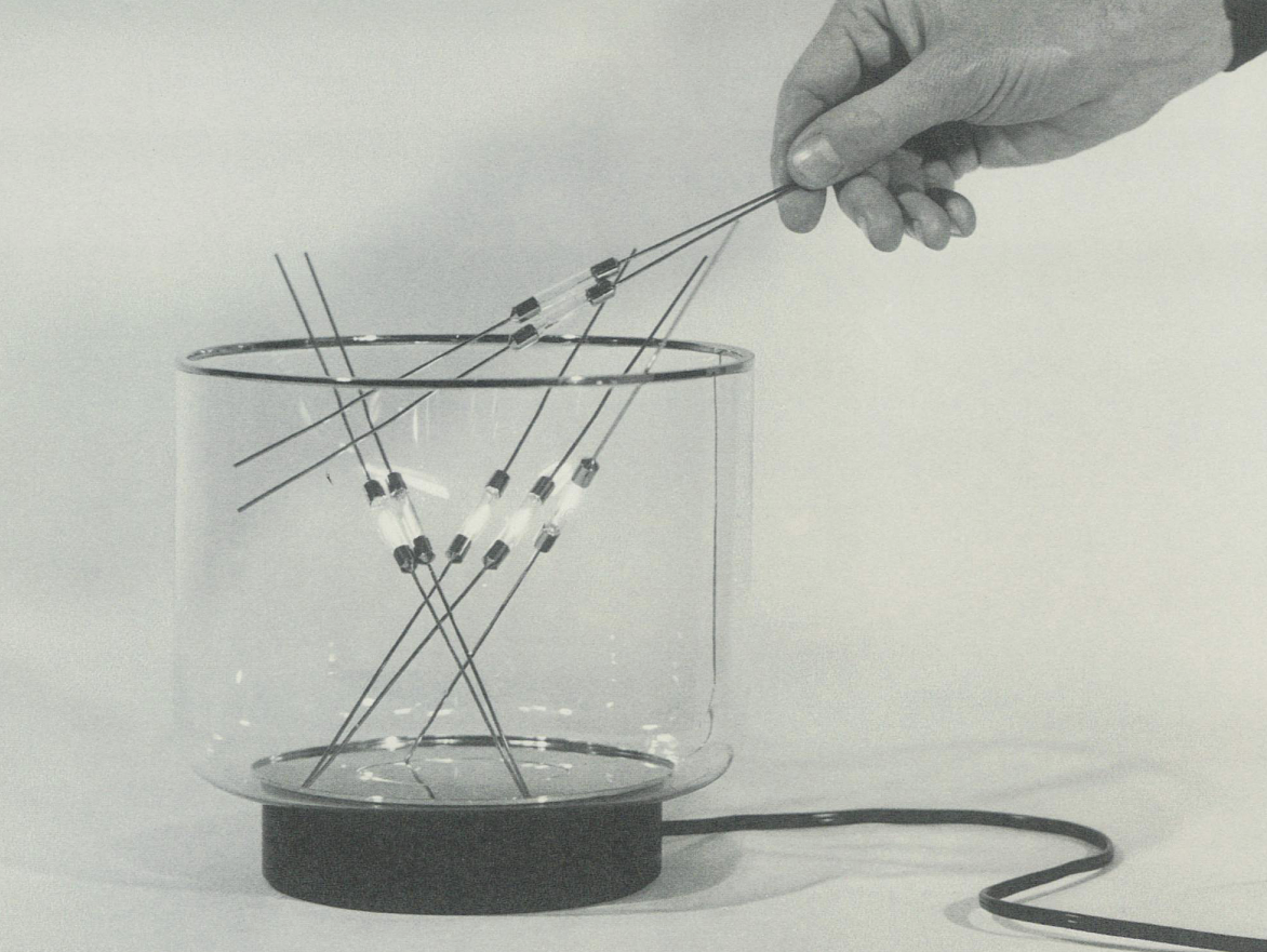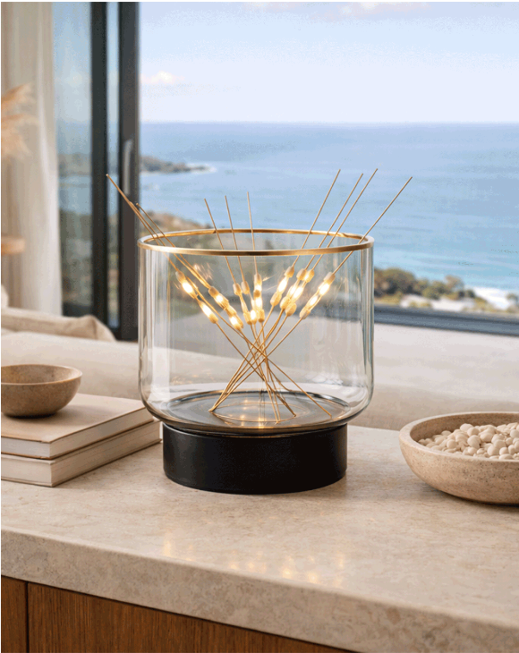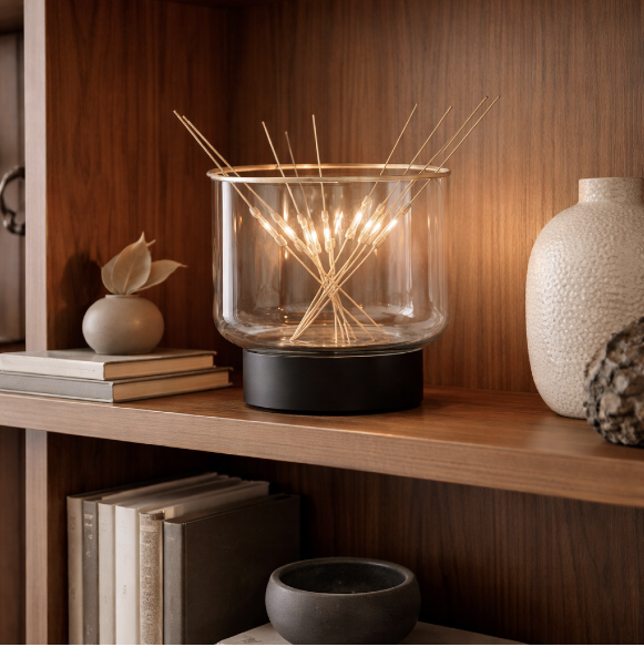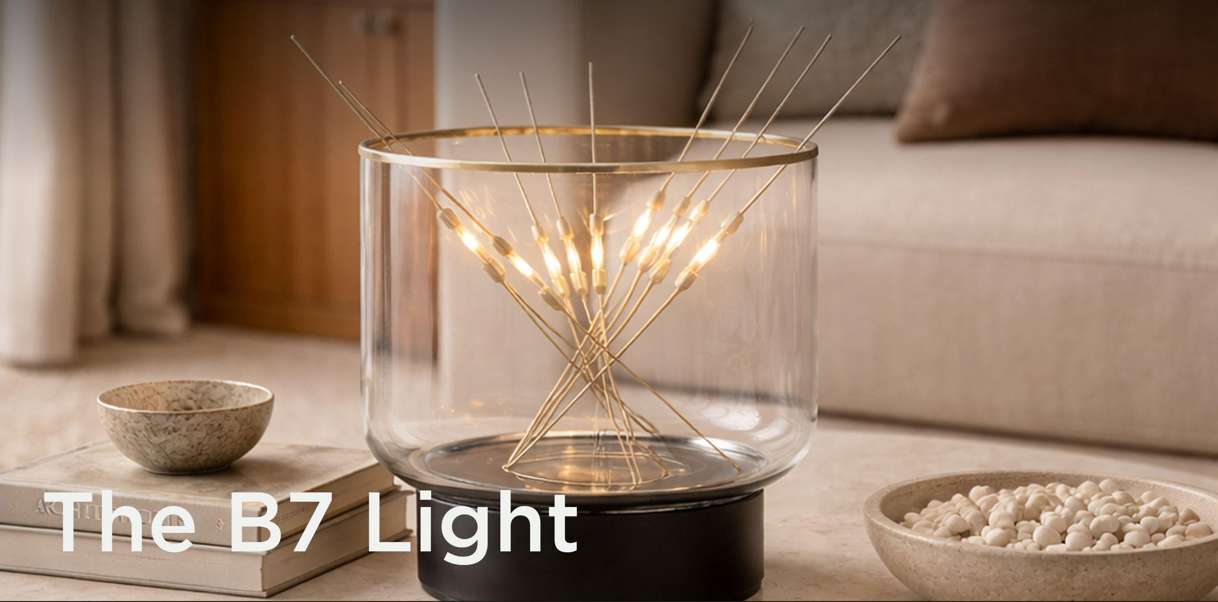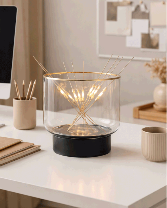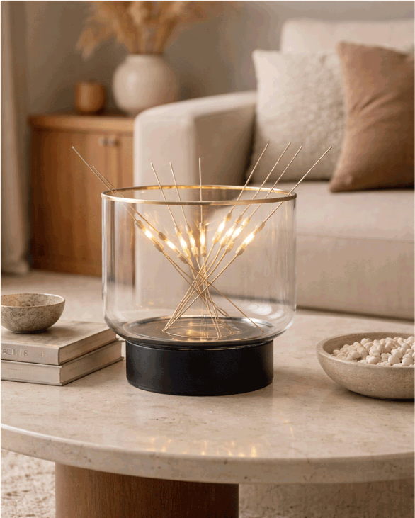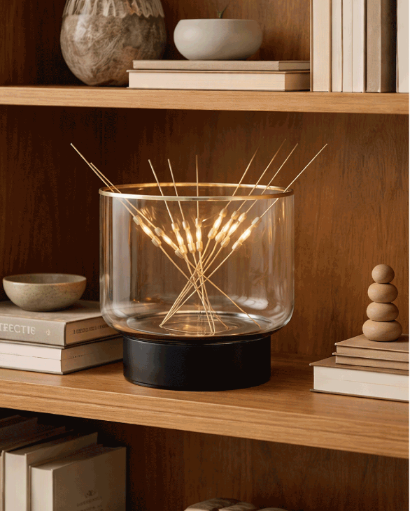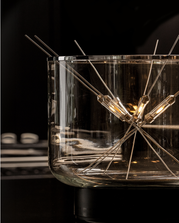 The B7 is a precise balance between function, technology, and poetry. While the gesture seems random, the construction is rigorous: the base contains a transformer that keeps the interaction safe. The bottom plate features a subtle groove to hold the stick ends, while the curved glass allows them to rest without shorting the circuit. Technology remains invisible; what emerges is the the experience, not the device.